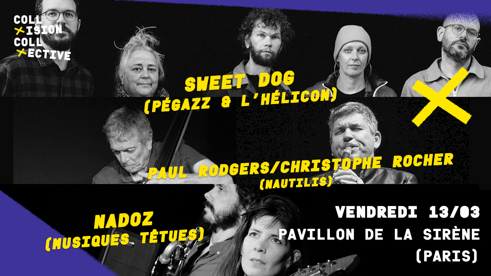Une soirée sous le signe de la création collective : Nadoz (Musiques Têtues), Sweet Dog (Pégazz & l’Hélicon) et le duo Rocher–Rogers (Nautilis) se retrouvent pour un concert en tri-plateau. Trois visions singulières du jazz d’aujourd’hui, nourries d’improvisation, d’énergie et de liberté, dans le cadre de Collision Collective, initiative inter-collectifs née pour augmenter la visibilité des musiques créatives.